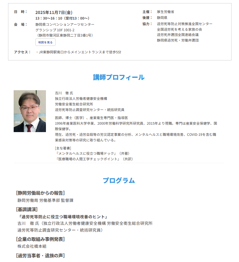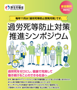 毎年11月は「過労死等防止啓発月間」です。 厚生労働省では、過労死等の防止を含め持続可能な就労環境の整備等について、 広く国民の関心と理解を深めるための啓発を行うこととしています。 その一環として、下記のとおり「過労死等防止対策推進シンポジウム」を開催します。 多くの皆様のご参加を心よりお待ちしております。