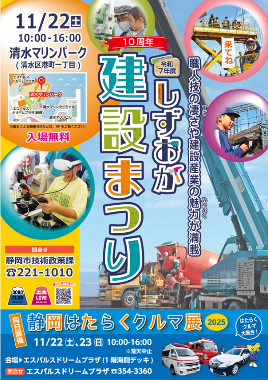 「しずおか建設まつり」が“令和7年11月22日(土)清水マリンパーク”にて開催されます。職人技のすごさや建設産業の魅力が満載のイベント。クレーン車や高所作業車などへの体験乗車、ARやVR体験、鉄筋工や配筋工などの職業体験など、子どもから大人までの幅広い年代層まで楽しめる内容です。今年は「静岡はたらくクルマ展」(11/22~23)と同日開催します。